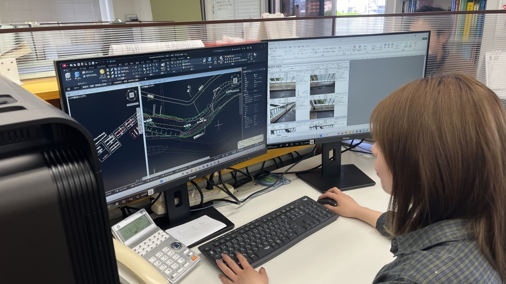 設計部は主に橋の補修設計を行っています。CADを使って図面を書いたり、補修に必要な計算などをします。私も最初は何も分からず、図面を書くにも時間がかかっていました。